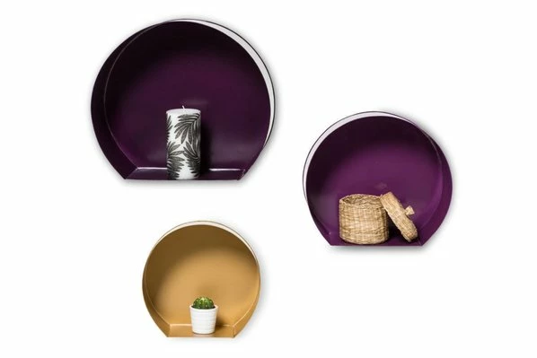 Das 3er-Set der Wandregale TRIPLE erhalten Sie in aktuellen Farben. Die Regale sind aus Metall und von Außen in Weiß gehalten. Im Inneren sind diese pflaumefarbig und eines goldfarbig. Die Form ist rund wobei die Böden gerade sind, um etwaige Dekoration oder Ähnliches zu platzieren. Sie sind vielfältig kombinierbar und