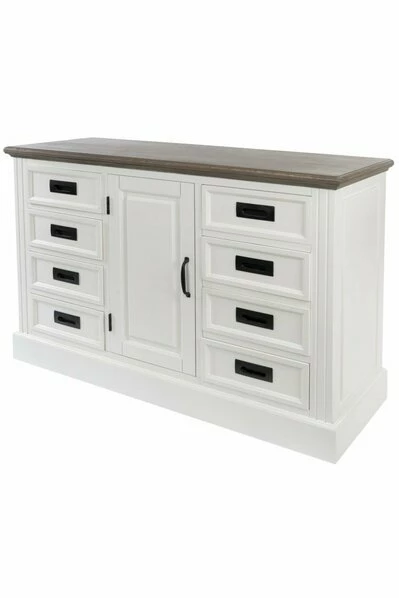 Viel Stauraum durch 8 praktische Schubladen sowie ein Ablageboden hinter der Tür zeichen diese Anrichte vorrangig aus. Die auf Holzleisten laufenden Schubladen sind einfach zu öffnen dank der schwarzen Kunststoffeingriffe. Die braune obere Holzplatte mit grau gewischten Akzenten lädt zum dekorieren ein.