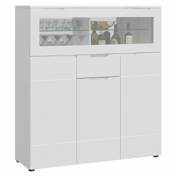 Im modernen Design und in zeitloser Farbgebung kommt dieser geräumige und 120 Zentimeter breite Barschrank HILTON daher. Hinter einer Klappe findest du zwei Glaseinlegeböden, auf denen du deine Flaschen, Gläser und Zubehör verstauen kannst. Weitere Gegenstände kannst du ganz einfach hinter den drei Drehtüren oder in dem Schubkasten unterbringen. Der Barschrank ist ein echtes Stauraumwunder und überzeugt zudem durch die grifflose Optik.
