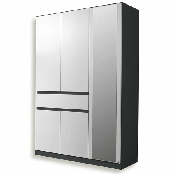 Mit einer Breite von etwa 136 cm bietet Ihnen dieser Drehtürenschrank hinter fünf Türen und in einem Schubkasten reichlich Platz zum Verstauen Ihrer Kleidungsstücke. Die große Tür ist mit einem “push-to-open”-Beschlag versehen und die kleineren Türen, sowie der Schubkasten, sind mit Griffmulden ausgestattet. Im Innenraum übernehmen drei Einlegeböden und eine Kleiderstange die ideale Aufteilung.