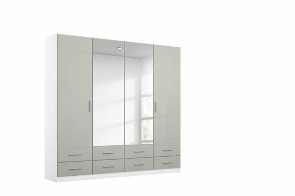 Viertüriger Drehtürenschrank in Alpinweiß mit einer Hochglanz-Front in Soft Grey. Die Farbgebung und das Design lässt sich mit den unterschiedlichsten Wohnstilen kombinieren. Der Kleiderschrank umfasst acht Schubkästen, zwei Kleiderstangen und drei Fachböden. Für ausreichend Geräumigkeit und Stauraum für Ihre Kleidungsstücke und Accessoires ist mit diesem Kleiderschrank gesorgt. In zwei Spiegeltüren können Sie ihr Outfit überprüfen und stets bestens gestylt aus dem Haus gehen.