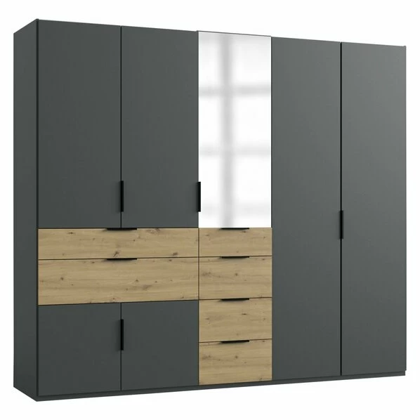 Dieser Drehtürenschrank in Graphit mit Absetzungen in Artisan Eiche Nachbildung ist ein echtes Raumwunder. Er ist mit insgesamt sieben Drehtüren und sechs Schubkästen ausgestattet, damit Sie all Ihre Kleidungsstücke perfekt unterbringen und einteilen können. In einem der Schubkästen finden Sie sogar ein Accessoire-Fach für Gürtel, Taschen oder sonstige Accessoires. Die Kleiderstangen bieten ausreichend Platz für Ihre Jacken, Blusen oder Hemden.
