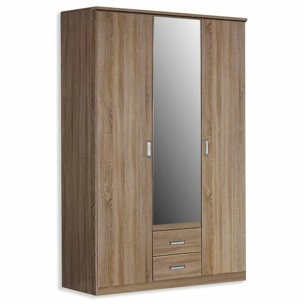 Drehtürenschrank JULIA in Sonoma Eiche Optik. Der Schrank verfügt über drei Türen und zwei Schubkästen. Zwei Einlegeböden und zwei Klederstangen sorgen innen für eine gute Aufteilung. Des Weiteren befindet sich ein Spiegel auf der Front was zusätzlich für ein schönes Design sorgt. Das Format lässt sich auch prima in kleine Räume stellen.