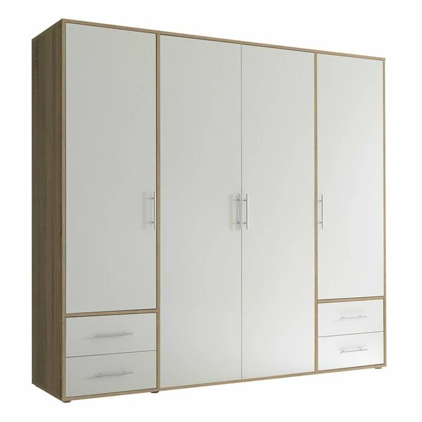 Der Drehtürenschrank sorgt wegen der Sonoma Eiche Nachbildung und der weißen Front für ein echtes Highlight in deinem Zimmer, welches dir garantiert gefallen wird. Die vier Schubkästen und die vier Türen sorgen für ausgiebigen Platz, sodass du dir keine Sorgen mehr um deine Ordnung machen musst.