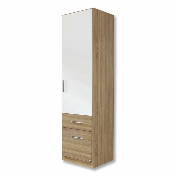 Der kompakte Drehtürenschrank hat eine Tür mit weißer Hochglanzfront und darunter zwei unterschiedlich großen Schubkästen im Farbton Sonoma Eiche. Dieser Farbton ist identisch mit dem des Korpus und sorgt in Ihrem Zuhause für ein natürliches Flair. Eine eingebaute Kleiderstange bietet Platz für Jacken, Hemden oder Blusen. Dieser Schrank ist einfach ein Highlight und aufgrund seiner Größe auch in kleineren Zimmern optimal stellbar und punktet zusätzlich durch sein modernes Erscheinungsbild.