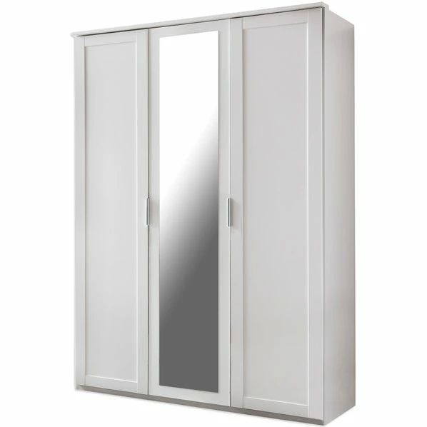 Mit dem Drehtürenschrank richten Sie Ihr Schlafzimmer stilvoll ein. In einem eleganten Weiß gehalten, passt er zu jeder Wand- und Bodenfarbe. Hinter seinen drei Türen finden Sie ein großes und ein kleines Element. Beide sind jeweils mit einer Kleiderstange und einem Einlegeboden ausgestattet, so dass Sie Raum für Ihre Kleidung haben.