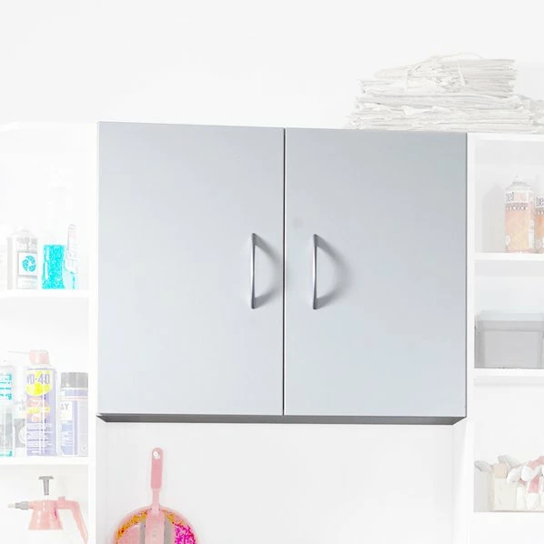 Der Hängeschrank aus Holz ist weiß foliert und mit zwei Türen ausgestattet. Die silberfarbenen Griffe sind aus Kunststoff.