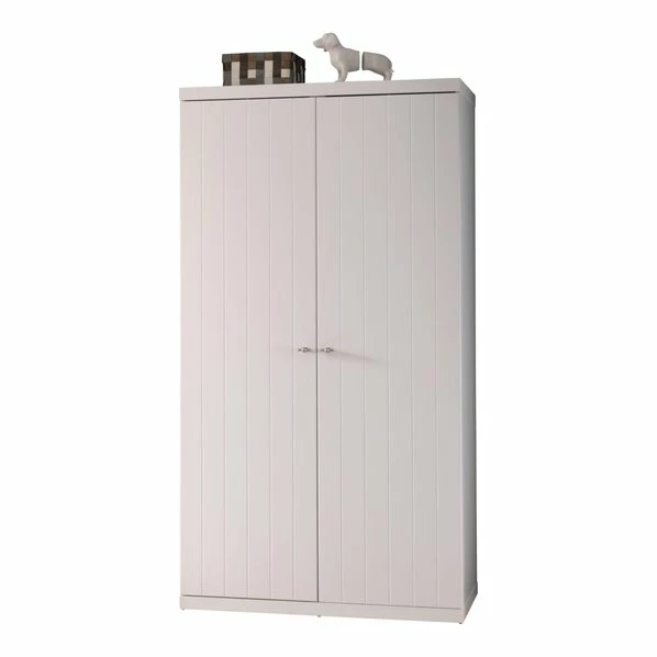 Der Kleiderschrank ROBIN ist in Landhaus-Optik gehalten. Diese präsentiert sich mit einer klassischen Rillenfräsung die eine Planken-Optik zaubert. Zwei Drehtüren bilden die schicke Front. Innen ist er auf der linken Seite mit Kleiderstange und Facheinteilung für Wäsche ausgestattet und rechts sind vier verstellbare Einlegeböden. Die Inneneinteilung kann reversiebel montiert werden.