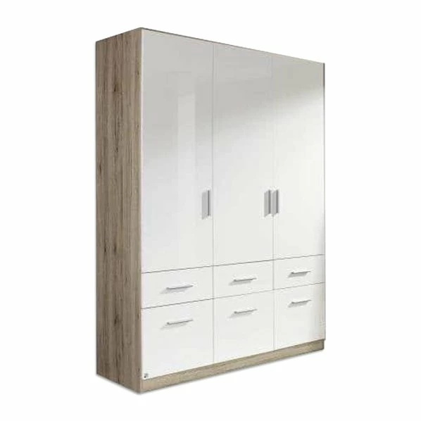 Schöner Kleiderschrank mit viel Platz für verschiedene Kleidung und Lagerungsmöglichkeiten. Schlicht gehalten in Sanremo Eiche und einer weißen Hochglanzfront.