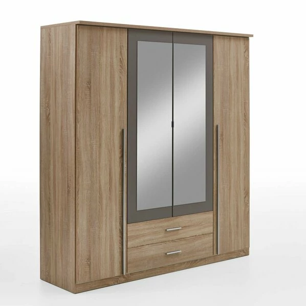 Der schöne Drehtürenschrank hat eine interessante Frontgestaltung und überzeugt mit viel Stauraum. Der Spiegel in der Mitte bekommt durch farbige Absetzungen in Lavagrau einen schönen Rahmen. In den unteren kleinen Schubkästen kannst du allerlei Kleinigkeiten verstauen. Die extra großen Stangengriffe verleihen dem Schrank eine super moderne und edle Optik. Die naturgetreue Holzstruktur in Kombination mit den Lavagrauen Absetzungen macht richtig was her! Auch die praktischen Spiegeltüren wirst du nicht mehr missen wollen – absolut hilfreich beim Ankleiden im Schlafzimmer. Die Innenaufteilung dieses Drehtürenschranks ist hervorragend durchdacht, da man genug Platz hat um Kleidung aufzuhängen, aber auch hinzulegen.