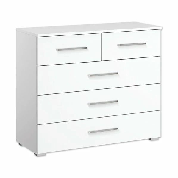 Praktische und vielseitig einsetzbare Kommode in Alpinweiß Die matte Kommode hat 5 Schubkästen mit 2 kleinen und 3 großen Schubladen. Silberne Füße und Griffe bilden einen tollen Kontrast zum eleganten Weiß der Kommode.