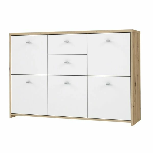 Diese moderne Kommode ist in Artisan Eiche Nachbildung mit Fronten in Weiß gehalten und sorgt somit für einen echten Hingucker. Sie überzeugt aber nicht nur durch ihr Design, sondern auch durch die Stauraummöglichkeiten. Die Kommode ist mit fünf Türen und zwei Schubkästen ausgestattet, in denen Sie all Ihre Utensilien unterbringen können.