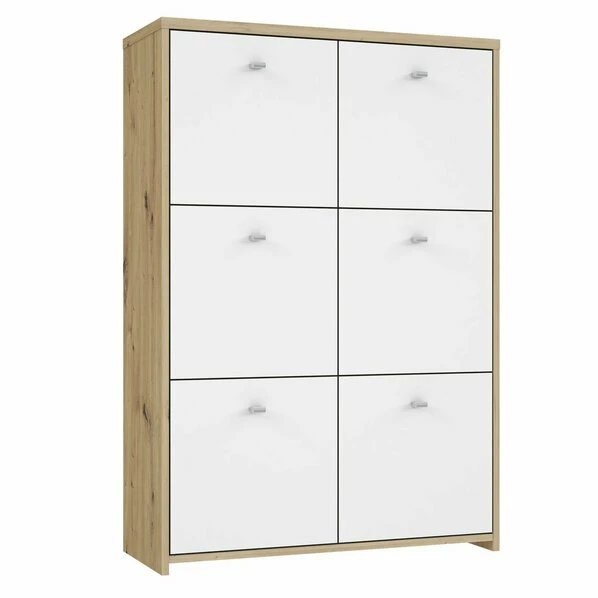 Diese Kommode ist in einer Artisan Eiche Nachbildung gehalten und die weißen Türen sorgen für einen wunderbaren Kontrast. So gibt die Kommode einen schönen Beitrag zum Gesamtbild des Zimmers. Zudem bieten die sechs Fächer, die mit Türen verschlossen sind, einen guten Stauraum. Die Türen lassen sich mit alufarbenen Griffen öffnen.