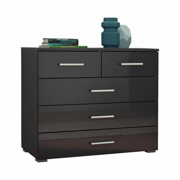 Diese effektgraue Kommode in Hochglanz brauchen Sie einfach in Ihrer Wohnung! Sie überzeugt durch ihr schlichtes Design, aber auch durch den Stauraum. In den fünf Schubkästen befindet sich Platz für all Ihre Utensilien.