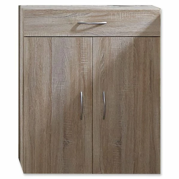 Die Kommode ist universell einsetzbar. Die Kommode aus Holz ist in Eiche sägerau Nachbildung foliert und kann einfach mit anderen Einrichtungsstilen kombinert werden aber auch mit dem gleichnamigen Programm. Hinter den zwei Türen befinden sich zwei Einlegeböden die in der Höhe variiert werden können und außerdem befindet sich über den Türen eine Schublade für Kleinkram.