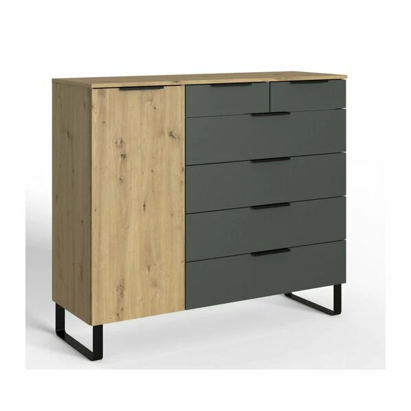 Mit dieser modernen Kommode holen Sie sich jede Menge Stauraum in ihre vier Wände! Sie überzeugt durch Artisan Eiche Nachbildung mit Absetzungen in Graphit und den Kufenfüßen aus Metall. Insgesamt sechs Schubkästen und zwei Einlegeböden bieten ausreichend Platz für Ihre Utensilien.