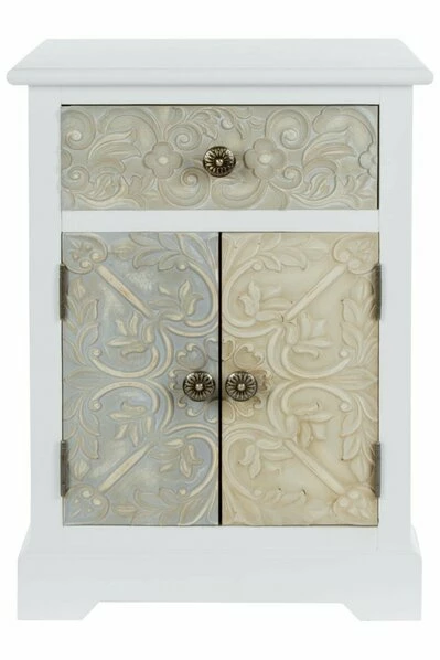 Die Kommode INEZ fällt durch ihre aufwendig verzierten Fronten mit einem modellierten Muster in Pastellfarben besonders ins Auge. Durch die dezente Farbgebung ist die Kommode aber nicht kitschig. Die floralen Knäufe, die als Griffe dienen, unterstreichen den romantischen Charkter der Kommode. Hinter den beiden Drehtüren haben Sie ein großes Fach und auch ein Schubkasten steht Ihnen für kleinere Utensilien zur Verfügung.