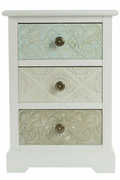 Die Kommode INEZ stattet Sie mit drei Schubkästen aus und kann als Kommode oder Nachtschrank fungieren. Der Korpus in Weiß ist mit den Schubkästen bestückt, dessen Fronten mit Liebe verziert worden sind. Sie sind in Beige, Creme und Mint gemustert. Sie lassen sich mit Hilfe der Metall-Griffe in floralem Design öffnen.