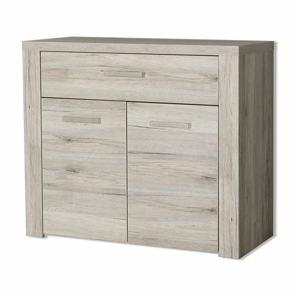 Klare Form in schicker Sandeichen-Optik, so präsentiert sich die Kommode. Die gut 96 cm breite Kommode beinhaltet eine großzügige Schublade mit 2 darunter gelegenen Türen. Die silberfarbenen Griffe fügen sich wunderbar in das Gesamtbild ein.