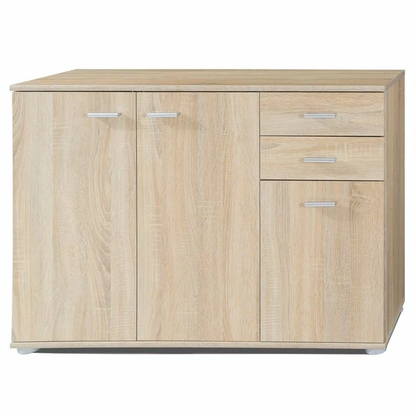 Diese Kommode in schicker Sonoma Eiche-Optik ist besonders praktisch aufgeteilt. Hinter den beiden großen Türen auf der linken Seite befinden sich 2 Fächer und rechts hinter der kleineren 1 großer Stauraum. Zudem gibt es 2 Schubfächer und die Ablagefläche eignet sich zum Beispiel sehr gut für Dekorationszwecke.