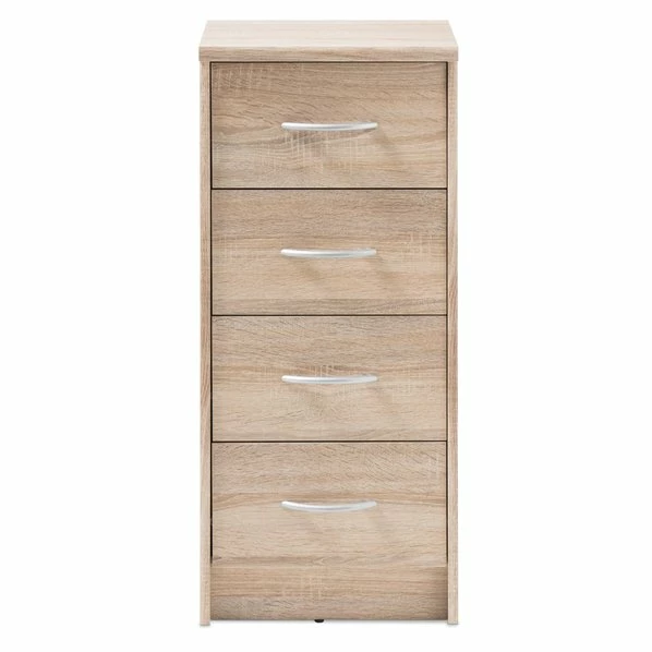 Die Kommode in schicker Sonoma Eichen-Optik bietet mit vier Schubkästen eine Menge Stauraum. Die Ablagefläche eignet sich zum Beispiel sehr gut für Dekorationszwecke.
