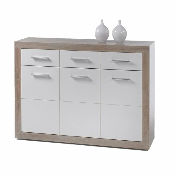 Schöne Kommode in der Farbkombination Sonoma Eiche Nachbildung und Weiß! Die alufarbigen Griffe runden das Design zusätzlich ab. Hinter drei Türen befinden sich insgesamt zwei Einlegeböden, welche ausreichend Platz für all deine Utensilien bieten. Zusätzlichen Stauraum findest du in den drei Schubkästen