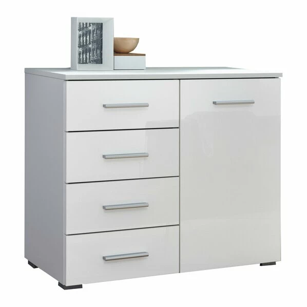 Diese weiße Kommode in Hochglanz brauchen Sie einfach in Ihrer Wohnung! Sie überzeugt durch ihr schlichtes Design, aber auch durch den Stauraum. In den vier Schubkästen und hinter der Drehtür befindet sich Platz für all Ihre Utensilien.