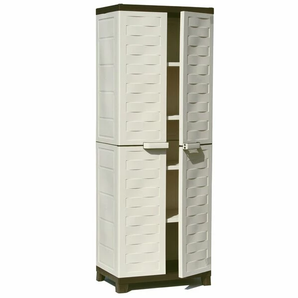 In diesem Kunststoffschrank finden viele Gegenstände ihren Platz. Jeder der vier Böden ist mit etwa 20 kg belastbar und bietet somit viele Einsatzmöglichkeiten. Sorgen Sie mit diesem Schrank für Ordnung in Ihrem Keller, Abstellraum oder Gartenhäuschen.