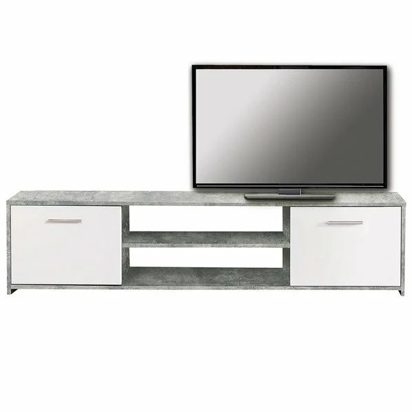 Das topmoderne Lowboard hat eine Breite von 160 cm und ist in einer Beton-Optik gehalten. Die weiß abgesetzten Türen runden die raffinierte Optik noch zusätzlich ab und sorgen für das gewisse Etwas. Hinter zwei Türen finden Sie reichlich Platz um die unterschiedlichsten Dinge zu verstauen und zwei Gerätefächer bieten Platz für Ihr TV-Zubehör.
