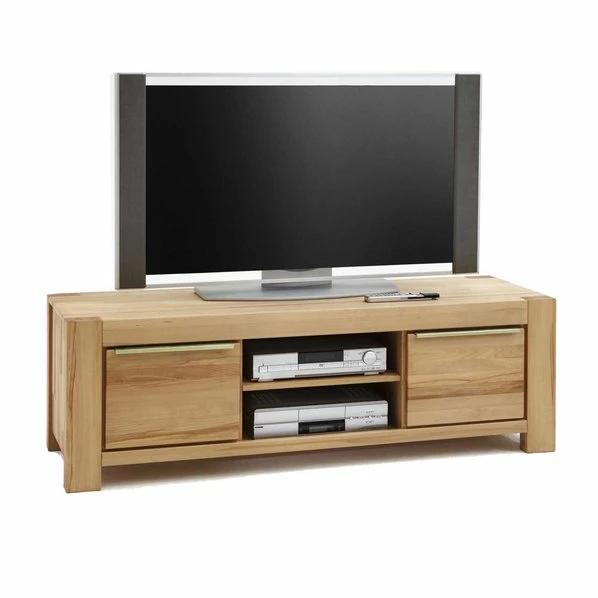 Robustes Lowboard aus Kernbuche Massivholz mit 2 Türen und 2 offenen Fächern. Dieses Lowboard eignet sich mit seinen Gerätefächern und der 1,55 Meter breiten Oberfläche perfekt für Ihren Fernseher und Zubehör. Hinter den außen liegenden Türen befinden sich 4 Fächer.