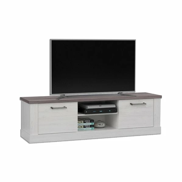 Sehr schönes Lowboard, was Ihr Wohnzimmer bereichern wird. Der Korpus ist in heller Pinie gehalten und erhellt auch den Raum optisch. Die Oberplatte ist abgesetzt in Touchwood, wodurch das Board einen besonderen Look erhält. Rechts und links befindet sich jeweils ein Schubkasten, der Ihnen Raum für Filme, Kabel, Servietten oder ähnliches gibt. In den beiden Fächern finden Ihre Elektrogeräte Platz und dank der Kabeldurchführung verschwindet es auch durch die Rückwand.