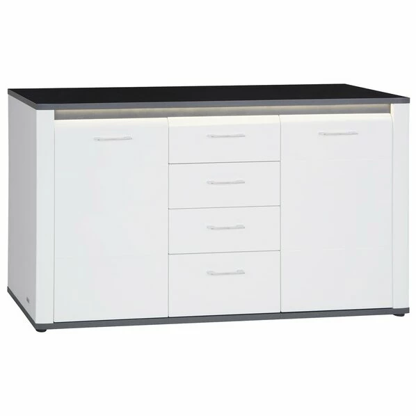 Diese Kommode in Weiß Hochglanz ist mit vier Schubladen und zwei Türen ausgestattet. Dadurch verschaffen Sie sich zusätlichen Stauraum und sorgen für mehr Ordnung in der Wohnung. Die verchromten Metallgriffe runden das moderne Design des Möbelstücks perfekt ab. Ein besonderes Highlight ist das integrierte LED-Licht.