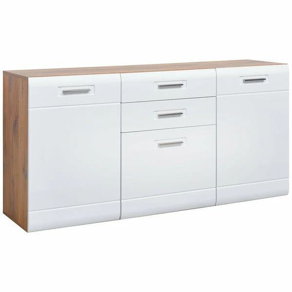 In zwei großzügigen Schubkästen und hinter drei Türen überzeugt das Luca Bessoni Sideboard mit vielen Stauraummöglichkeiten. Die Innenräume werden von vier Einlegeböden in praktische Fächer aufgeteilt. Für ein modernes Ambiente in deinem Wohnraum sorgt die Farbkombination aus Flagstaff Eiche Nachbildung und Fronten in Weiß.