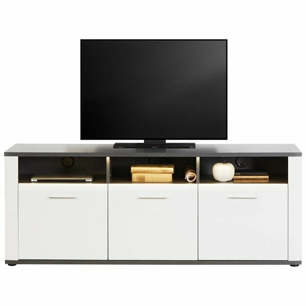 Das TV-Lowboard ALASSIO erstrahlt im hellen Weiß, das ausgezeichnet durch den Absatz in Matera Dunkel ergänzt wird. In den drei offenen Fächern haben Sie ausreichend Platz zum Abstellen Ihrer Receiver oder beispielsweise einer Spielkonsole. Durch einen Kabelkanal können Sie die Kabel direkt zum Fernseher führen. Im Inneren des Schrankes haben Sie die Möglichkeit das zu lagern, was Sie gerne in Griffnähe haben, aber doch lieber hinter einer Tür verstauen wollen. Komfortable Extras sind die chromfarbenen Metallgriffe sowie die angenehme Türdämpfung.