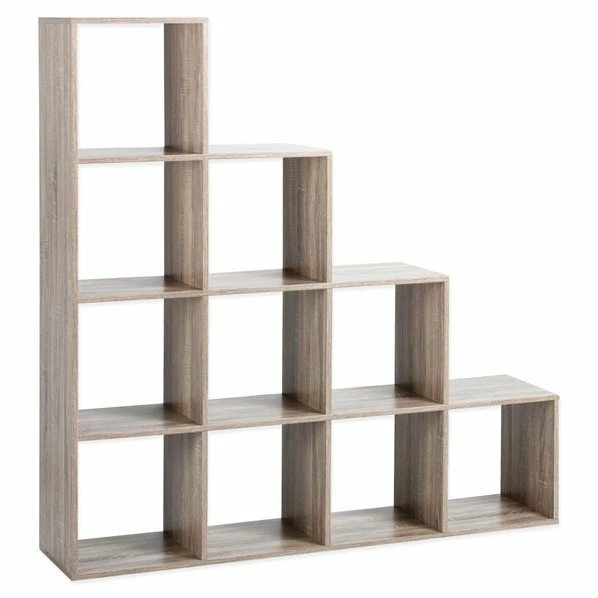 Der Raumteiler hat eine natürliche Holzoptik in Sonoma Eiche und besteht aus 10 offenen Fächern. Das große Stufenregal eignet sich perfekt um ein Zimmer in einzelne Bereiche einzuteilen und bietet mit seinen 10 Fächern umfangreiche Abstell- und Dekorationsmöglichkeiten. So lässt sich auf einfache Art und Weise ein getrennter Schlaf- und Wohnbereich erzeugen.