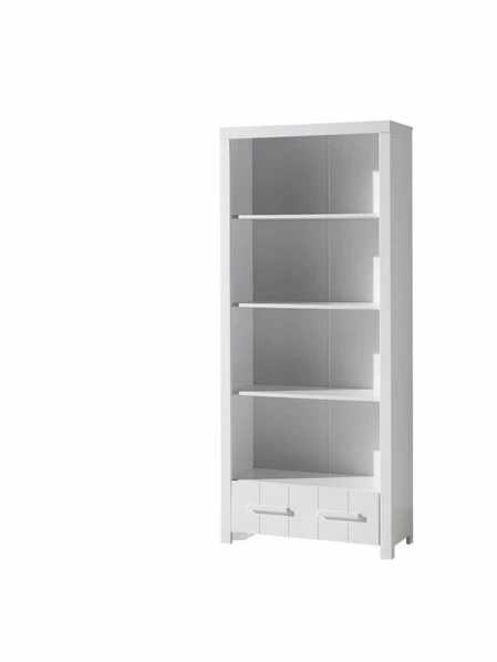 Das Regal ERIK ist mit vier großen Fächern und einer großzügigen Schublade die optimale Lösung um allerlei Dekoration, Bücher oder Anderes zu platzieren. Das Regal präsentiert sich in beliebter Landhaus-Optik aus weiß lackiertem Holz. Die drei Böden sind nicht verstellbar. Die Beschläge sind aus Metall.