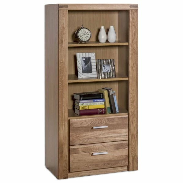Das Standregal ist aus teilmassiver Wildeiche mit Griffen in Aluminium. Dies ergänzt sich stilvoll und wird Ihr Wohnzimmer um schönen Stauraum erweitern. Stellen Sie Ihre Lieblingsstücke in den drei offenen Fächern aus. In zwei Schubkästen können kleine Utensilien, wie Kerzen oder Servietten.
