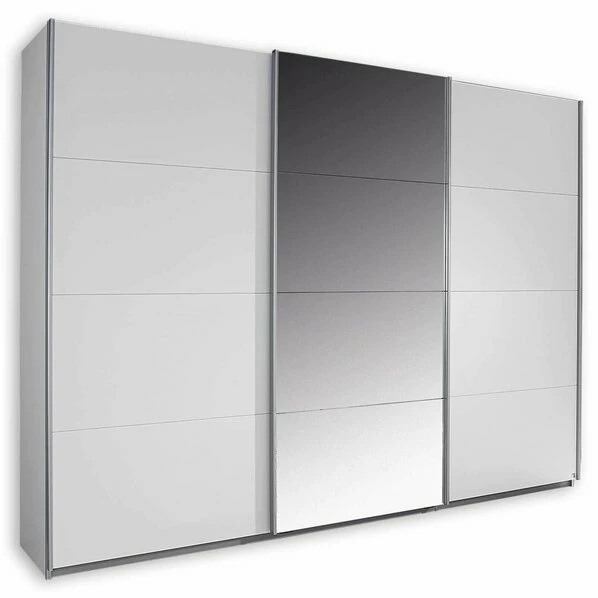 Alpinweißer Schwebetürenschrank mit drei Türen. Dieser knapp über 2,70 Meter breite Schrank ist in der Mitte mit einer Spiegeltür ausgestattet. Innen befinden sich pro Einheit, je ein Einlegeboden mit darunter liegender Kleiderstange, also jeweils drei an der Zahl. Dieser Kleiderschrank bringt moderne Frische in Ihr Schlafzimmer und ist dabei unglaublich praktisch.