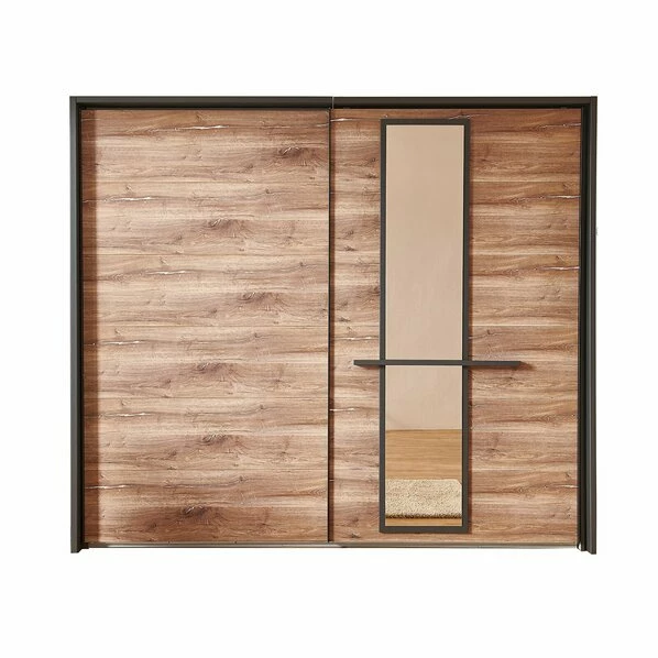Der modische Schwebetürenschrank überzeugt mit seinem schönen Mix aus Flagstaff-Eiche-Nachbildung sowie den graphitfarbenen Absätzen. Dazu kommt ein praktisches Spiegelelement. Auf drei Einlegeböden sowie mit drei Kleiderstangen haben Sie im Inneren Platz zur Aufbewahrung Ihrer Kleidungsstücke.
