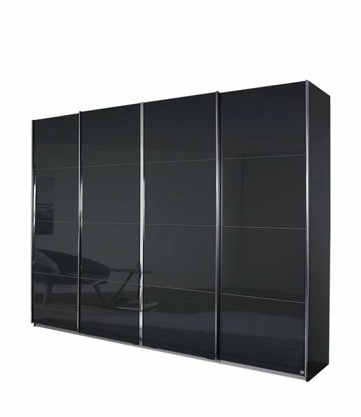 Der Schwebetürenschrank ist modern und stylisch in der Ausführung Grau Metallic. Die Kombinationmit der Front aus vier Basaltglastüren macht ihn zum echten Hingucker. Neben seinem optischen Auftreten bietet er reichlich Stauraum für Ihre Kleidung. Hinter den vier Schwebetüren, die sich platzsparend seitlich verschieben lassen und nicht in den Raum hinein ragen, finden Sie vier Elemente. Jedes Element ist mit einer Kleiderstange und einem Einlegeboden ausgestattet, so dass Pullover, genauso wie Mäntel, ihren Platz finden werden.