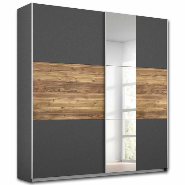 Der graue Schwebetürenschrank sorgt mit seiner Breite von etwa 175 Zentimetern für reichlich Stauraummöglichkeiten. Hinter den beiden Türen wird der Innenraum durch eine Trennwand, zwei Kleiderstangen und zwei Einlegeböden ideal aufgeteilt, sodass Sie Ihre Kleidung oder andere Gebrauchsgegenstände übersichtlich und ordentlich verstauen können. Mit dem Spiegel können Sie noch einmal Ihr Outfit prüfen, bevor Sie aus dem Haus gehen und der Alltag beginnt. Für das gewisse Etwas sorgt der rustikale Absatz in Appenzeller Fichte Nachbildung, der einen tollen Akzent setzt und ein warmes Ambiente in Ihrem Schlafzimmer versprüht.