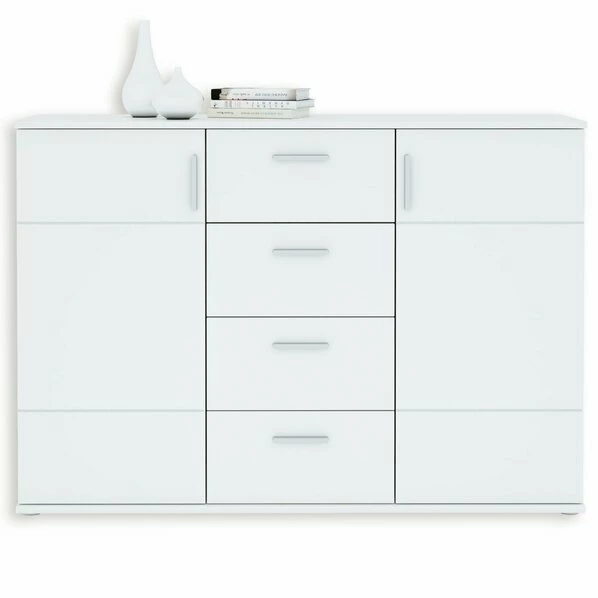 Mit vier Schubkästen, zwei Türen und zwei Einlegeböden bietet Ihnen das Sideboard in Alpinweiß viele Stauraummöglichkeiten. Zudem begeistert es mit einem zeitlosen Design, das nie aus der Mode kommt und zu den unterschiedlichsten Einrichtungsstilen passt.