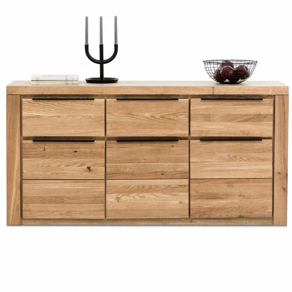 Das Sideboard ist nicht nur ein echter Ordnungshüter, zudem wurden die Fronten aus massivem Eichenholz gefertigt, die dadurch sehr langlebig und robust sind. Hinter drei Türen und in drei Schukästen können Sie einige Gebrauchsgegenstände verstauen. Die große Ablagefläche bietet sich optimal für Dekorationszwecke an.