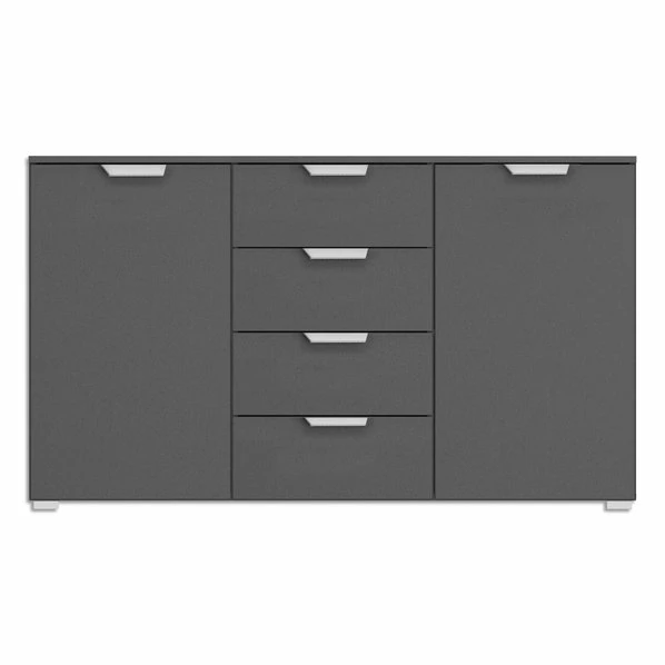 Schönes Design trifft auf praktische Umsetzung. Dieses Sideboard ist komplett in Grau-Metallic gehalten, sodass sie ein bisschen im Licht schimmert. In vier Schubkästen findet sich reichlich Stauraum für allerlei Dinge, wie Servietten, Hefte, Süßigkeiten, Besteck etc. Für größere Stücke befinden sich hinter den Drehtüren insgesamt vier Fächer. Nutzen Sie diese z.B. für große Schüsseln. Das Sideboard besitzt viele Einsatzmöglichkeiten, egal, ob im Wohnzimmer, Esszimmer, Flur oder als Ergänzung zum Schlafzimmerschrank – alles ist möglich.