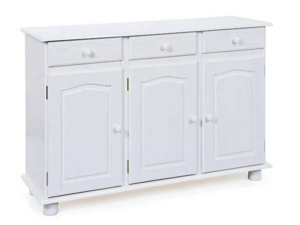 Das Sideboard LIVIO wurde aus robustem Kiefer Massivholz gefertigt und in einem zeitlosen Weiß lackiert. Es ist ein wahrer Ordnungshüter und bietet hinter den drei Türen zwei große Flächen, um die verschiedensten Gebrauchsgegenstände zu verstauen. In den drei Schubkästen können kleinere Utensilien untergebracht werden.