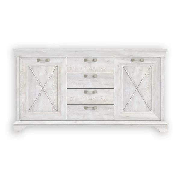 Das schöne Sideboard im wohnlichen Landhaus-Stil begeistert mit Design und Stauraum. Die Kommode ist ausgestattet mit vier Schubkästen, zwei Türen und zwei Einlegeböden und bietet Ihnen so viel Platz. Das weiße Pinien-Dekor schafft in jedem Zuhause ein wohnliches und gemütliches Ambiente.