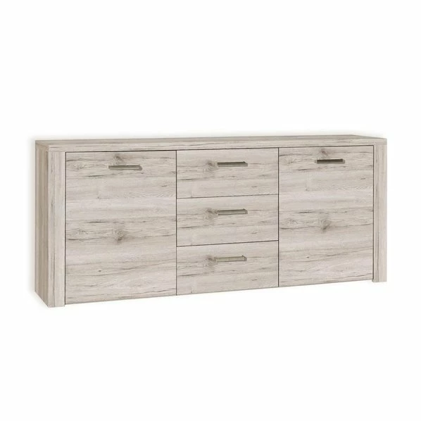 Modernes Sideboard mit viel Stauraum in Sandeiche Nachbildung. Zwei Türen und drei Schubkästen sorgen für eine gute Aufteilung. Die Edelstahlgriffe sorgen zusätzlich für ein tolles Design. Ob im Flur, im Schlafzimmer oder in anderen Räumen dieses Sideboard lässt sich vielseitig kombinieren und bietet viel Stauraum.