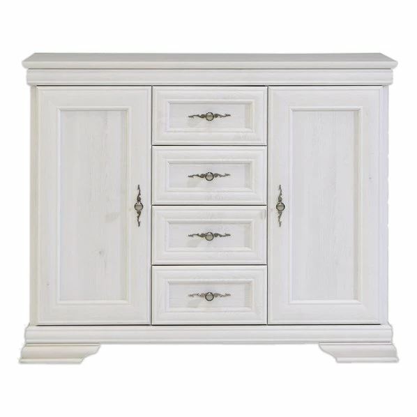 Das Sideboard hat eine wunderschöne Schneeeichen-Optik. Hinter den 2 Türen mit je 2 Fächern und in die 4 Schubkästen passt allerhand Hausgut. Egal ob Geschirr, Bücher oder Dekoelemente, das Sideboard bietet allerhand Stauraum für unzählige Dinge in Ihrem Haushalt. Der Stil des Sideboards ist an den klassischen Landhausstil angelehnt und verkörpert dennoch Modernität. In Verbindung mit weiteren Möbeln aus unserem Wohnprogramm können Sie ein einheitliches Wohnkonzept erzeugen.