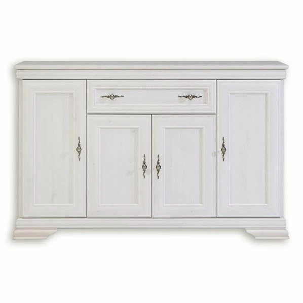 Das Sideboard präsentiert sich in stilvoller Schneeeiche Nachbildung. Hinter vier Türen teilen insgesamt drei Einlegebönden den Innenraum dieser Kommode ideal auf, sodass Sie viele Ihrer Utensilien dort unterbingen können. Für kleine Sachen eignet sich der vorhandene Schubkasten bestens.