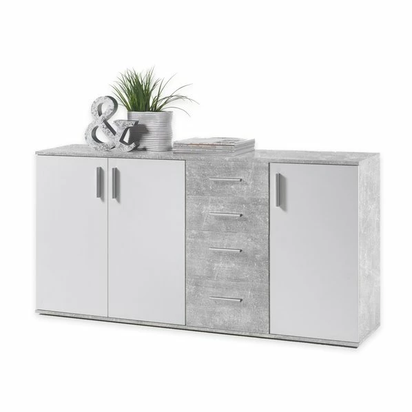 Mit diesem Sideboard erhält Ihr Wohnraum ein modernes Möbelstück mit viel Stauraum und in einem außergewöhnlichen Design. Der graue Korpus in Beton-Optik bildet zu den drei weißen Türen einen tollen Kontrast und wird durch die Fronten der vier Schubkästen zusätzlich verstärkt. Ein toller Aufbewahrungsort mit unzähligen Einsatzmöglichkeiten.